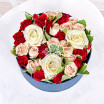 Нежные одноголовыерозы алого и белого цветавыглядят роскошно, их прелесть и свежесть подчеркивают очаровательные и милые цветы кустовых роз нежно-кремового и красного цвета. Элегантно дополняет это цветочное совершенство зелень декоративного питтоспорума.