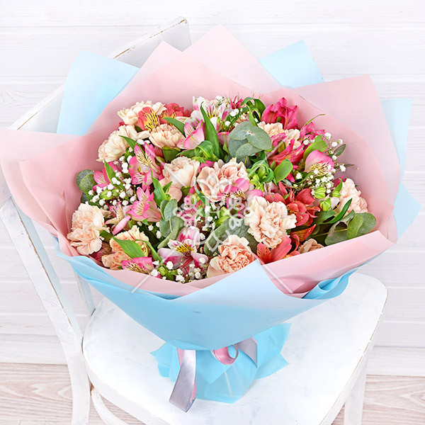 гвоздика персиковая – 5 шт., альстромерия розовая, красная – 4 шт., зелень декоративная (эвкалипт, гипсофила), упаковка, лента.